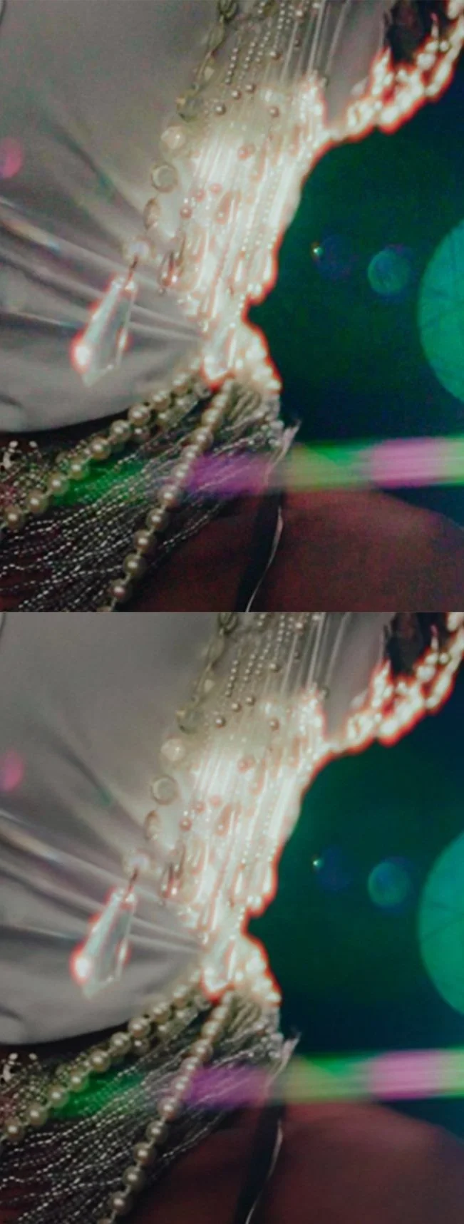 The histogram above illustrates that the images predominantly lean towards the left, indicating that they were mostly captured in shadow or underexposed conditions. By strategically placing control points and anchoring both shadow and midtone areas, I managed to effectively separate the subject from the background. However, because the relfection off the cinema screen isn't strong enough, I had to find other ways to create highlights on the subject. I then decided to apply a star filter to catch flares off the subject. Our costume features a lot of reflective surfaces, which became ideal for the concept. A completely dark environment with controlled lighting has long been recognized as ideal for human sensorial manipulation. This principle underlies why cinema, theater, and circus performances all take place or are screened in darkness—a spotlight of focused attention. In terms of post-production, dealing with underexposure tends to be less problematic than managing overexposure, especially considering we're shooting on digital cameras rather than film. I was able to play with the light curve with controlling point of the shadow in both red, green, and blue channels to create a vintage-look to ease-out the grainy images.